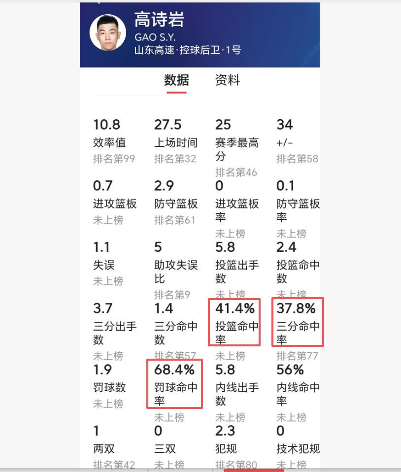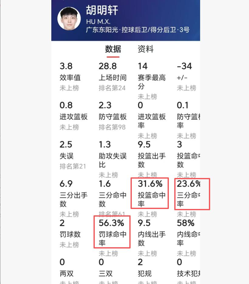 现在网络上流传一句话:广东队也有一个“高铁”,甚至比山东高铁还离谱。不说不知道,一查吓一跳。经过查看数据,胡明轩本赛季真的是比山东高铁还离谱。的三项命中率是41%、37%、68%,而胡明轩是31%、23.6%、56.3%,投篮命中率、三分命中率和罚球命中率都比山东高铁低。你难以想象,顶薪球员和队长的罚命中率不到6成,三分命中率只是2成多。胡明轩本赛季真是中了邪了。